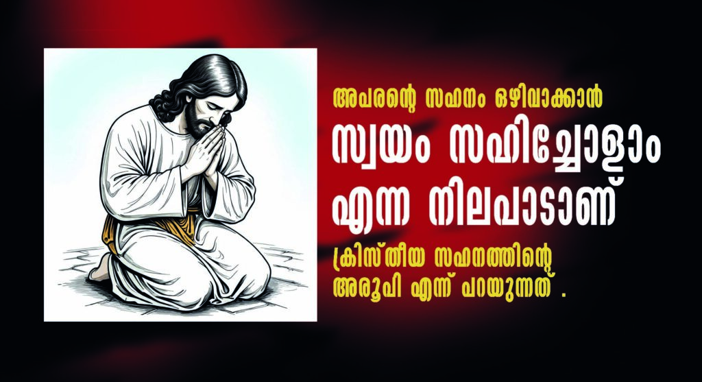 സഹിക്കുവാൻ സാധിക്കുകയുള്ളു. വരും തലമുറ സുഖമായി ജീവിക്കാൻ വേണ്ടിയാണു ഇപ്പോഴത്തെ തലമുറ ചോര നീരാക്കി പണിയുന്നത് എന്ന് നാം ഓർക്കണം. കഴിഞ്ഞ തലമുറ സഹിച്ചതു കൊണ്ടാണ് ഇന്നത്തെ തലമുറ ഒരു പരിധി വരെ സുഖമായി കഴിയുന്നത്. അപരന്റെ സഹനം ഒഴിവാക്കാൻ സ്വയം സഹിച്ചോളാം എന്ന നിലപാടാണ് ക്രിസ്തീയ സഹനത്തിന്റെ അരൂപി എന്ന് പറയുന്നത് .